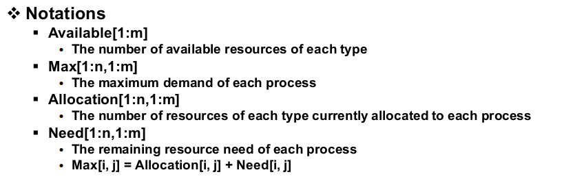 max matrix는 i번째 프로세스가 j번째 리소스를 최대 몇 개까지 요청할 수 있는지를 담고 있습니다. (각 프로세스가 요구할 수 있는 맥시멈 리소스 수를 표현), allocation도 matrix로 allocation[i, j]라고 하면 i라는 프로세스가 j라는 타입의 리소스를 현재 몇 개 할당 받고 있는지를 표현합니다. (현재 리소스 할당 상태를 표현)