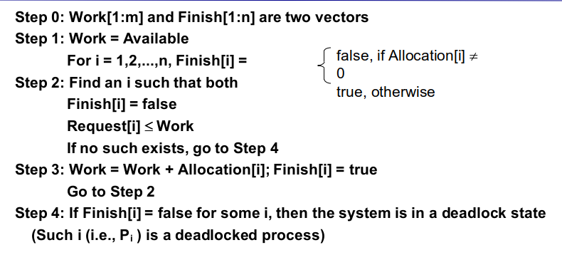 이렇게 스탭2와 스탭3를 계속 루프를 돌면서 프로세스별 pending request들을 다 실행시키고 끝나면 finish 벡터에 true로 표시한 다음 리소스를 반환받습니다. 스탭4 전에 모든 프로세스가 끝나면 데드락이 없는 경우이고 만약 available한 리소스보다 더 많은 리소스를 원하는 프로세스가 존재해 스탭 4로 넘어가게 된다면 데드락이 발생하는 것입니다.