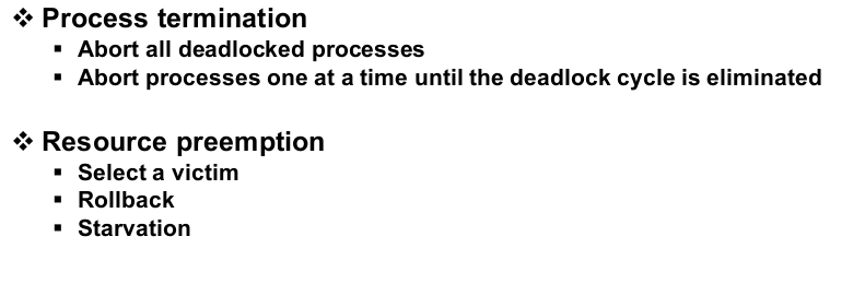 데드락이 발생하면 프로세스를 중지하는 것 외에는 해결책이 없습니다. 데드락이 발생한 프로세스 중 하나를 termination 시키고 리소스를 반환받아서 다른 프로세스들이 실행할 수 있도록 만들어주는 것이 데드락 recovery 입니다. 이렇게 중지시켜 리소스를 반환받으려면 rollback이라는 것이 필요합니다.