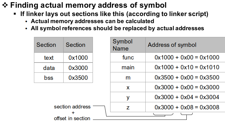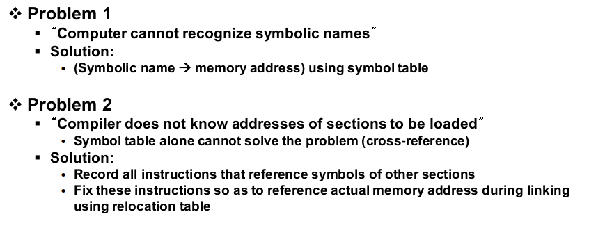 링커가 링킹을 하기 위해서 해결해야되는 2가지 문제가 존재합니다. 첫 번째는 모든 심벌에 address를 부여한다는 것과 각 section에 흩어져 있는 external reference, cross reference의 주소를 결정하고 다 교체하는 작업을 해야 합니다.