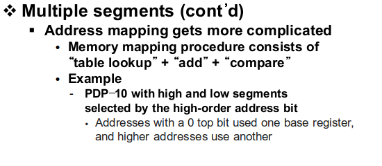 이런 문제점을 해결하기 위해서 하나의 프로세스에 여러 메모리 청크를 할당하게 되는데 이것이 segmentation입니다. 이렇게 메모리 청크가 늘어나면서 OS도 점점 복잡해지는데 그 이유는 세그먼트가 한 개라면 base, bound register fair를 하나만 유지하면 되지만 여러 개의 세그먼트가 생기면 address translation을 위해서 각 세그먼트마다 base, bound register fair를 관리해야 합니다.