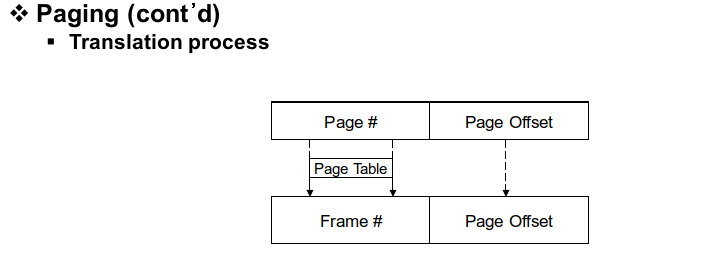 이렇게 페이지와 프레임으로 나눠져 있는 상태에서 address translation을 진행해 보겠습니다. 처음으로 하는 일은 페이지를 프레임으로 매핑하는 작업입니다. 이 작업은 OS가 MMU의 도움을 받아 진행합니다. 페이지 넘버를 프레임 넘버에 매핑하는데 필요한 정보는 page table을 통해 얻습니다. (segmentation table과 유사, 똑같이 unmapped 영역에 존재, 만약 map 영역에 존재한다면 table에 접근하기 위해서도 translation이 필요해짐)