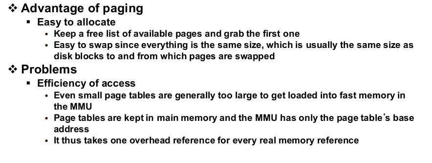 과거에는 segment 단위나 프로세스 전체의 이미지를 swap in/out 했지만 페이징에서는 페이지 단위로 swap in/out 할 수 있어 swapping에 대한 효율성이 증가합니다. 단점으로는 프로세스 당 page table을 유지하기 위해서 피지컬 메모리에 연속적으로 할당되는 공간이 너무 크다는 점과 segmentation과 마찬가지로 address translation을 하는 과정에서 메인 메모리에 있는 page table에 접근해야 하기 때문에 address translation 한 번당 다른 메모리 액세스 한 번이 발생한다는 것이 있습니다. (메모리 액세스 속도가 두 배만큼 나빠진다.)