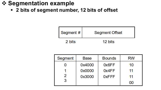 어떻게 address translation이 동작하는지 알아보겠습니다. 이 예시는 14bit address를 가지며, 상위 2bit는 segment number로 사용되고 하위 12bit는 offset으로 사용됩니다. 상위 2bit만 사용하기 때문에 table에서 구별이 가능한 세그먼트는 4가지가 됩니다.