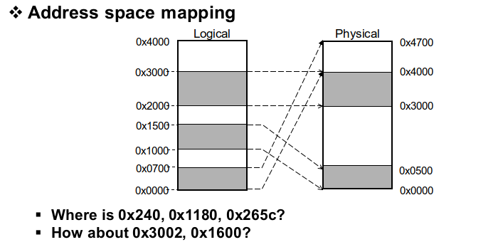 위 사진은 베이스 값과 바운드 값의 매핑된 형태를 도식화한 것입니다. 오른쪽의 경우 0부터 0x4000번까지의 로지컬 어드레스 스페이스를 갖는 프로세스 입니다. 0부터 700번지의 로지컬 어드레스 부분은 D램의 피지컬 메모리에 4000번지부터 4700번지에 매핑이 되어있는 것을 알 수 있습니다. 이 과정을 MMU는 table을 통해서 진행합니다.