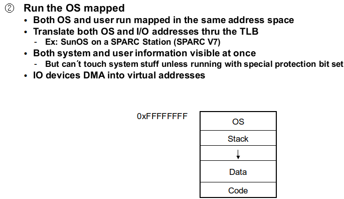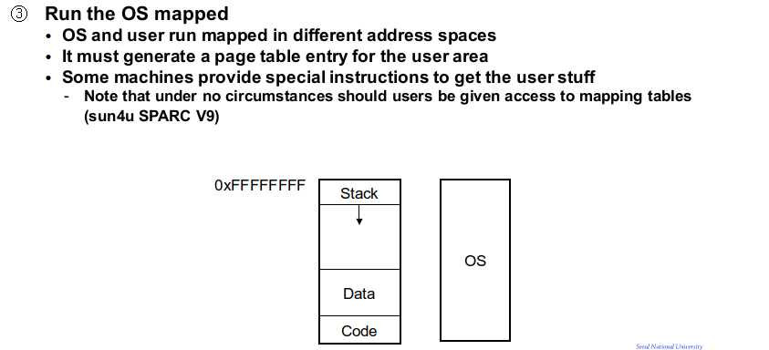 만약 OS를 별도의 어드레스 스페이스에 매핑시키게 되면 유저 프로세스가 시스템 콜을 호출했을 때 어드레스 스페이스가 체인지 변경되는 매핑으로 인해서 오버헤드가 발생할 수 있습니다.