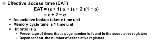 다음과 같은 간단한 수식을 통해서 메모리 레퍼런스를 할 때마다 effective memory access time을 계산할 수 있습니다. 여기서 중요한 척도는 hit ratio입니다. effective memory access time 작게 만들고 싶다면 hit ratio를 크게 만들어야 합니다.