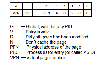 TLB를 자세히 알아보기 위해서 MIPS라는 마이크로 프로세서로 설명해보겠습니다. 위 사진은 TLB의 각 라인의 포맷으로 첫 번째로 페이지 넘버가 그다음 페이지 프레임 넘버 이후 여러 비트들이 TLB의 entry에 존재하는 것을 보여줍니다.