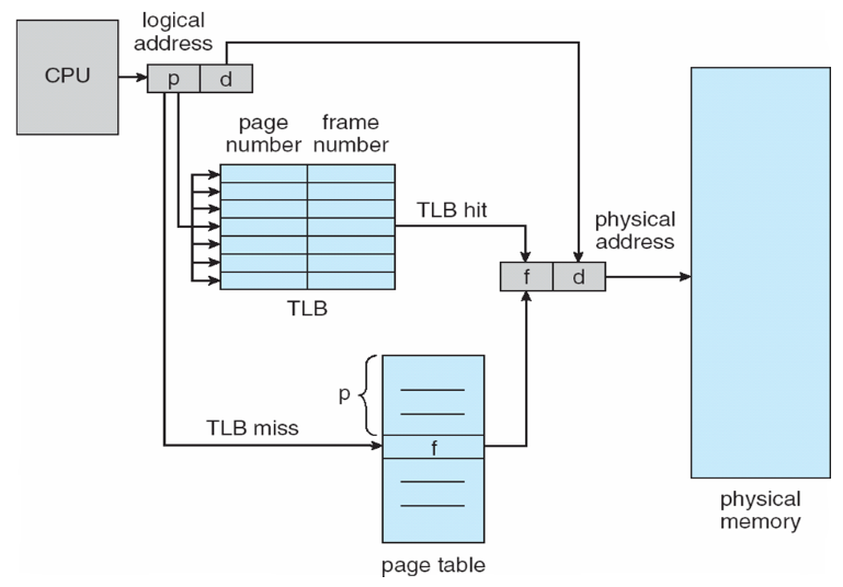 MMU는 CPU가 내보낸 로지컬 어드레스를 입력으로 받아 메인 메모리에 존재하는 페이지 테이블에서 정보를 읽어오기 전에 내부적으로 가지고 있는 캐시에서 해당 entry가 존재하는지 찾아봅니다. TLB에 원하는 entry가 존재한다면 메모리 액세스를 할 필요가 없어지게 되고 그러면 추가적인 메모리 레퍼런스 없이 translation이 가능하게 됩니다.
