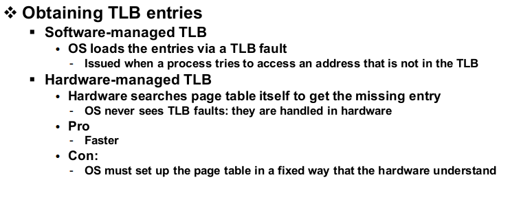 하드웨어적인 방법은 TLB miss를 하드웨어적으로 조절하는 방법으로 OS가 TLB의 내부 동작을 볼 수 없습니다. 하드웨어적인 TLB 관리는 굉장히 빠르고 OS에게 tramsparent 하다는 장점이 있지만 handling을 위해서 하드웨어가 page table의 위치를 전부 알고 있어야 되고 page table format까지 이해하고 있어야 한다는 단점이 존재합니다.