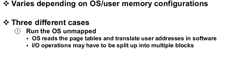 그래서 이 오퍼레이션을 10개로 나눠서 처리하게 됩니다. (하나의 DMA가 10개의 페이지를 처리하는 것이 아니라 10개의 DMA가 각각 1개의 페이지를 처리하는 방식), 다음 문제는 DMA 컨트롤러는 피지컬 어드레스가 필요하다는 점입니다. DMA 컨트롤러는 MMU를 거치지 않기 때문에 로지컬 어드레스를 이해할 수 없습니다. 그래서 OS가 사용자의 로지컬 어드레스를 피지컬 어드레스로 매핑시킬 수 있어야 합니다.