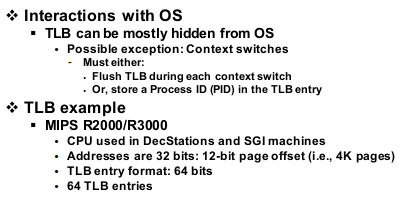 이런 문제를 해결하기 위해서 OS가 context switching이 발생했을 때 TLB의 entry를 전부 incalidate 시켜줍니다. 그러면 새로 들어온 프로세스에 대해서 TLB miss가 발생하면서 entry 값들을 채우게 됩니다. (TLB를 사용하더라도 처음에는 굉장히 많은 miss가 발생하여 메모리 레퍼런스의 성능이 저하된다.)