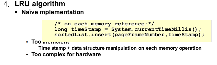 LRU 알고리즘은 액세스된지 제일 오래된 페이지를 쫓아냅니다. 때문에 제일 오래된 페이지를 구별하는 방법이 필요하게 됩니다. reference 빈번하게 일어나므로 reference가 될때마다 체크를 하는 것은 이런 정보를 기록하는 레지스터가 존재해야 하기 때문에 실행하기 힘든 방법입니다.