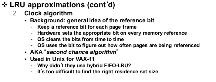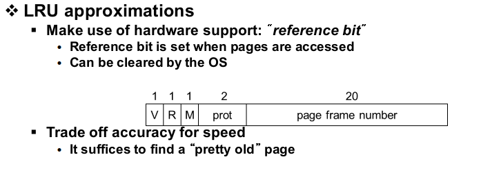 위와 같은 이유로 LRU를 직접 구현하는 것은 굉장히 어려운 일입니다. 그래서 대부분의 경우 LRU를 approximation합니다. reference bit를 두고 1로 증가시키는 방법을 사용하는데 이 방법은 카운트할 수 없기 때문에 얼마나 여러 번 reference된 페이지인지 알 수 없습니다. 또한 reference bit이 계속 켜져있다면 어느 시점에 켜졌는지 알 수 없기 때문에 주기적으로 clear합니다.