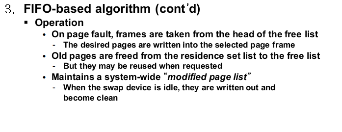 이 resident set안에 페이지들이 FIFO 형식으로 정렬되어 있습니다. 그래서 프로세스의 페이지들 중 들어온지 가장 오래된 것이 큐의 제일 앞에 있게 됩니다. 그러면 이 front에 있는 페이지가 밀려나게 되는데 밀려난 페이지는 free page list로 이동하게 됩니다. free page list도 FIFO 형식으로 관리가 됩니다. (resident set list는 프로세스마다 존재하는 FIFO list이고 free page list는 글로벌하게 하나만 존재하는 FIFO list)