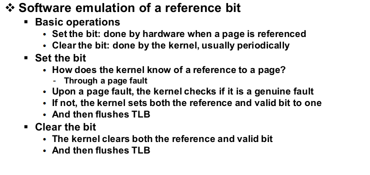reference bit를 하드웨어적으로 제공해준다면 문제가 없지만 제공해주지 않는 경우가 굉장히 많습니다. 이런 문제는 소프트웨어적으로 reference bit를 지원함으로써 해결이 가능합니다. 소프트웨어로 구현하던지 하드웨어적으로 지원하던지, reference bit는 1bit 플래그로 한 번 켜지면 계속 켜져있는 상태가 지속됩니다.