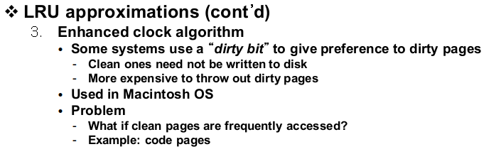 이런 클락 알고리즘을 조금 더 변형한 기법으로 page replace를 할 때 reference bit가 0이면서 clean page를 먼저 할당하는 기법이 존재합니다. 이런 방법은 Enhanced clock 알고리즘이라고 합니다. 클락 알고리즘을 관찰하면 컴퓨터 시스템의 메인 메모리가 얼마나 utilize 되고 있는지 또는 경합이 많이 발생하는지를 clock hand의 회전수로 파악할 수 있습니다.