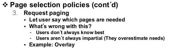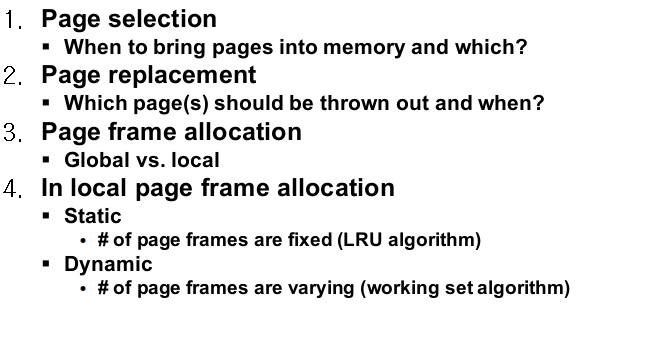 virtual memory management는 디멘드 페이징(Demand paging)을 합니다. 디멘드 페이징은 위와 같은 4가지 정책(policy)을 따릅니다. page selection은 페이지 폴트가 발생했을 때 요청된 페이지만 읽어오는 것이 아니라 locality를 생각해 주변에 있는 페이지까지 읽어오는 것을 고려합니다.