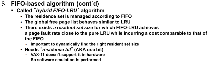 VAX VMS OS에서는 page replacement에서 FIFO 알고리즘을 사용할 때 local page allocation을 같이 사용했습니다. local page allocation는 프로세스 단위로 그 프로세스가 메인 메모리에 가질 수 있는 페이지의 개수를 다 고정시킵니다. 이렇게 메인 메모리에 가지고 있는 페이지들의 집합을 resident set이라고 부릅니다.