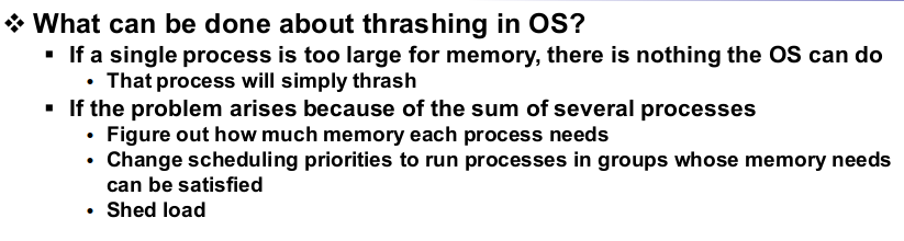 쓰레싱이 발생하는 이유는 시스템의 능력에 비해서 과도한 워크로드가 돌고 있는 것이기 때문에 어떤 policy를 사용하던지 해결하기 어려운 문제여서입니다. 우리가 주어진 시간 안에 여러 장소에서 일을 하면 실제적으로 일을 하는 시간보다 그 장소로 이동하는 시간이 더 많이 걸릴 것입니다. (이렇게 쓰레싱은 overhead operation만 하고 effective operation을 수행하지 못하는 것)