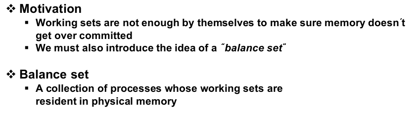 이런 문제들을 통제하기 위해 밸런스 셋(balance set)이 존재합니다. 밸런스 셋은 프로세스들이 가지고 있는 모든 페이지들의 집합으로 이 크기를 피지컬 메모리보다 작게 만들어 충분한 여유분의 메모리를 가지게 할당을 합니다.