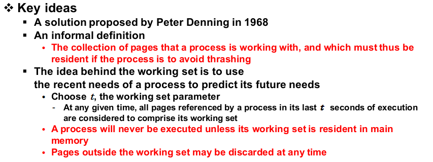 그래서 워킹 셋 윈도우 사이즈 t를 적절히 조절해야 합니다. 너무 크다면 워킹 셋이 커지게 되고 너무 작다면 워킹 셋에 페이지들이 충분히 들어갈 수 없는 문제가 발생합니다. 이런 문제들로 인해 1968년도에 제시된 워킹 셋은 단순히 개념적인 틀만 잡혔다고 할 수 있습니다.