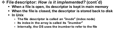 파일 디스크립터는 파일 콘텐츠와 함께 디스크에 존재합니다. 파일을 액세스할 때 파일 컨텐츠 주소 정보가 파일 디스크립터에 있으니 파일 디스크립터는 메인 메모리를 복사한 상태로 볼 수 있습니다. 파일 디스크립터에는 파일의 크기, 생성된 시간, 소유자나 그룹의 아이디 또는 protection bit 같은 것들이 저장되어 있습니다.