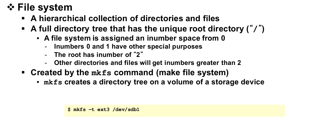 파일 시스템은 root로부터 시작되는 디렉토리 트리라고 할 수 있습니다. 하지만 OS 입장에서는 이 디렉토리 트리가 모두 매핑된 스토리지 구조가 파일 시스템이 됩니다. 그래서 OS에게는 파일 시스템이란 스토리지 상에 포맷된 잘 정렬된 조직 구조로 볼 수 있습니다.