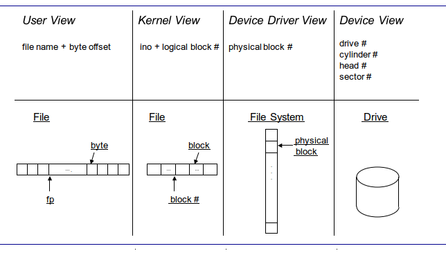 파일이라는 개념은 user view와, kernel view, device view가 각각 다릅니다. 하지만 결국에 디스크 스토리지에 있는 데이터를 액세스 한다는 점에서 drive view로 OS가 매핑을 시켜줘야 합니다. (파일은 다양하게 표현이 되는데 결국 하나의 드라이브로 매핑을 시켜야 한다.)