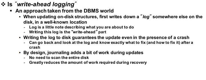 journaling은 file system crash나 power loss가 발생해도 복원이 가능하게 시스템을 만드는 방법을 이야기 합니다. 이를 가능하게 하는 핵심 아이디어는 logging입니다. 이 logging을 write-ahead logging이라고 부릅니다.