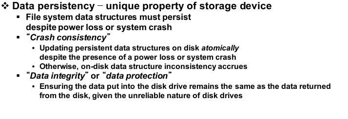 파일 시스템에서 퍼포먼스와 같이 중요한 요소가 reilability입니다. file system reliability을 한 단어로 표현하자면 data persistency라고 할 수 있습니다. 스토리지 디바이스가 비휘발성(non volatile) 메모리이기 때문입니다.