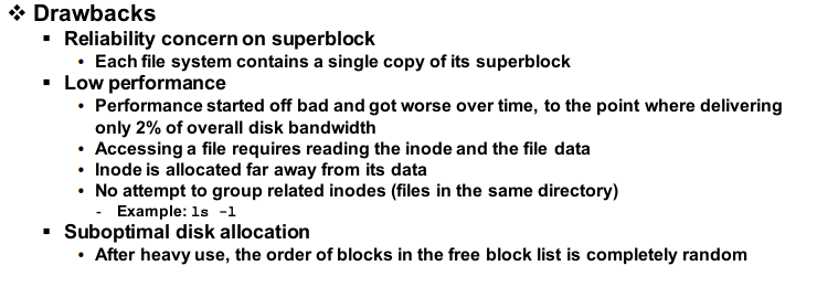 이렇게 단점들이 존재하기는 하지만 초창기 unix 파일 시스템은 작은 OS로 빠르고 간단하게 만든다는 목적을 가지고 있었기에 이런 파일 시스템 구조를 가지게 된 것입니다.