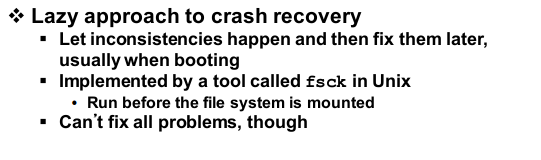 이렇게 파일 시스템 체커를 사용하여 문제를 해결하는 것을 Lazy approach라고 부릅니다. 사용자들이 file system inconsistency 대해 고려하지 않아도 알아서 뒷정리를 해주기 때문입니다. 하지만 이 fsck도 대부분의 inconsystency를 해결하기는 하지만 해결하지 못하는 부분도 존재합니다.