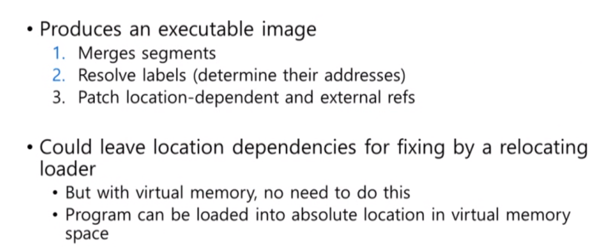 만약 버츄얼 메모리를 지원하지 않는다면 relocating loader를 통해서 location-dependencies 값들을 전부 바꿔줘야 하지만 현대에는 MMU 하드웨어를 통해서 저절로 바뀌어집니다. 컴퓨터가 아닌 작은 디바이스에서는 MMU가 없어 버츄얼 메모리를 지원하지 않는 경우도 종종 존재합니다.