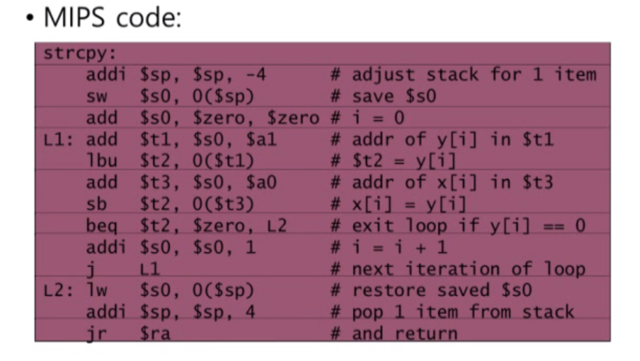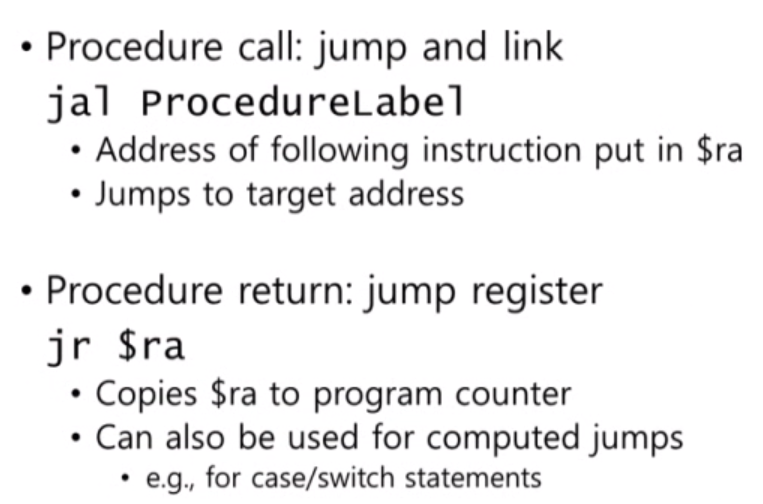 Procedure call에 대해서는 위 2가지 명령어를 자주 사용합니다. jal은 jump and link 명령어로 jal 다음에 이동할 procedure label를 적어두면 해당 명령어도 이동하게 됩니다. 이동하기 전 다음 명령어의 주소(Program Counter)는 ra에 저장되게 됩니다.