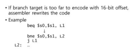 Branch target이 너무 멀리 있어 offset으로 encoding 할 수 없는 경우 assembler가 원래 코드 beq를 bne와 j로 바꾸게 됩니다. jump의 경우 26bit을 사용하기에 16bit로 갈 수 없는 곳을 갈 수 있습니다.