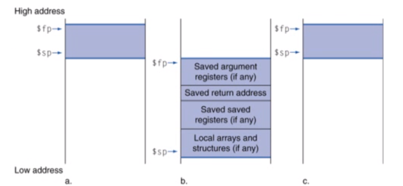 다른 함수들을 호출하는 경우 return address와 caller의 argument나 temporaries, pc 값을 stack으로 대피시켜야 합니다.