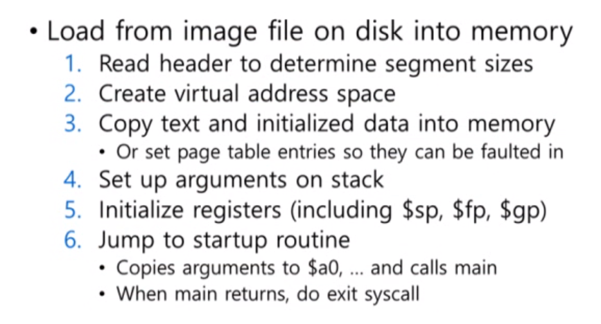 프로그램을 로딩하는 과정에 대해 알아보겠습니다. header를 읽고 각각의 세그먼트의 크기와 종류를 알아냅니다. 그 이후 virtual address space를 만들고 text와 data를 memory로 복사하거나 페이지 테이블 엔트리만 세팅합니다. (page fault가 발생했을 때 데이터나 코드를 메모리로 올리기 위해서)