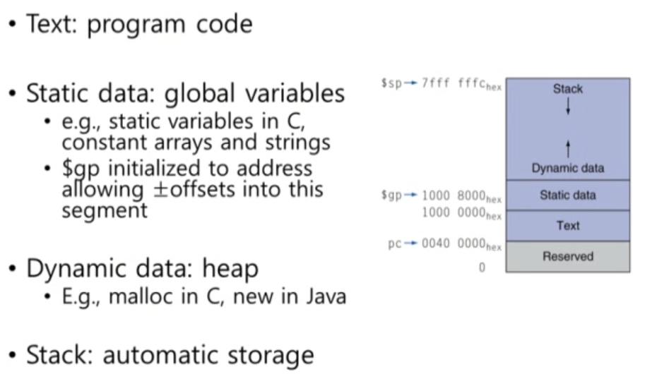 우리가 사용하는 프로그램의 메모리는 위 사진의 오른쪽과 같습니다. 제일 밑에는 reserved 그 위에는 text 영역으로 program code를 보관합니다. 그 위에는 global variable을 저장하는 static data 영역이 존재합니다. global pointer는 static data segment의 위치를 가르키고 있습니다. heap은 C에서 사용하는 malloc으로 영역을 할당할 때 사용되는 공간입니다. 그 윗부분이 stack 영역입니다.