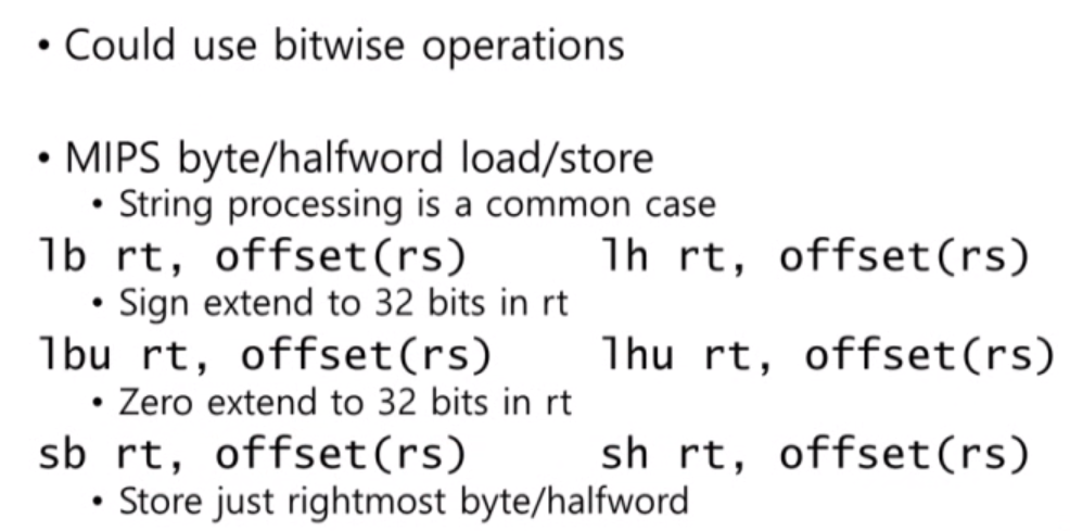 lb는 load byte로 target register로부터 특정 부분 즉 1바이트를 읽고 sign 값을 rt에 저장합니다. lb는 unsign 값을 저장합니다. sb는 store byte이고 sh는 store half ward로 targe register에 하위 16bit를 저장합니다.