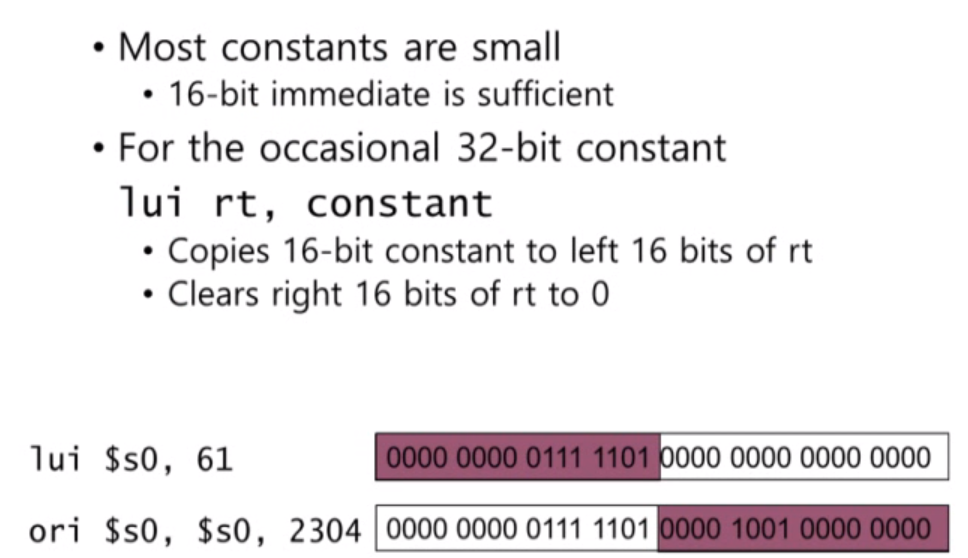 프로그래밍을 할 때 32bit 상수를 만들어서 사용할 때가 있습니다. 대부분의 경우에 작은 상수값을 사용하여 16bit면 충분하지만 큰 상수를 쓸 때가 있습니다. 이때 사용하는 명령어가 lui(load upper)로 constant 값을 target register의 상위 16bit로 읽어오고 나머지 하위 16bit는 0으로 만듭니다. (lb 같은 경우 레지스터의 하위 32bit에 넣은 반면에 여기서는 상위 16bit에 넣습니다.)