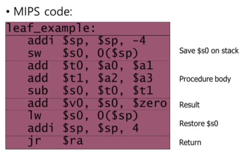 Leaf procedure란 하나의 함수에서 자기 자신이나 다른 함수를 부르지 않는 것을 말합니다. 이 함수에서는 파라미터가 4개 이기 때문에 argument register a0 ~ a3이 사용됩니다.