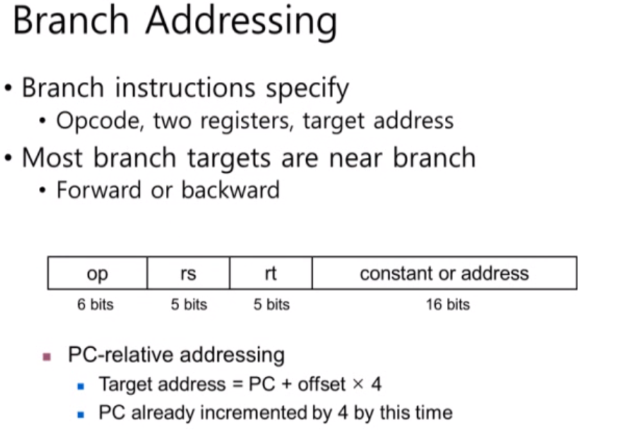 branch 명령어는 다음과 같이 32bits 구조를 가집니다. opcode와 sourse register, target register, constant나 address를 가집니다. 대부분의 brach target은 branch 명령어 주변에 있습니다. 이런 방식의 addressing을 PC relative addressing이라고 부릅니다.