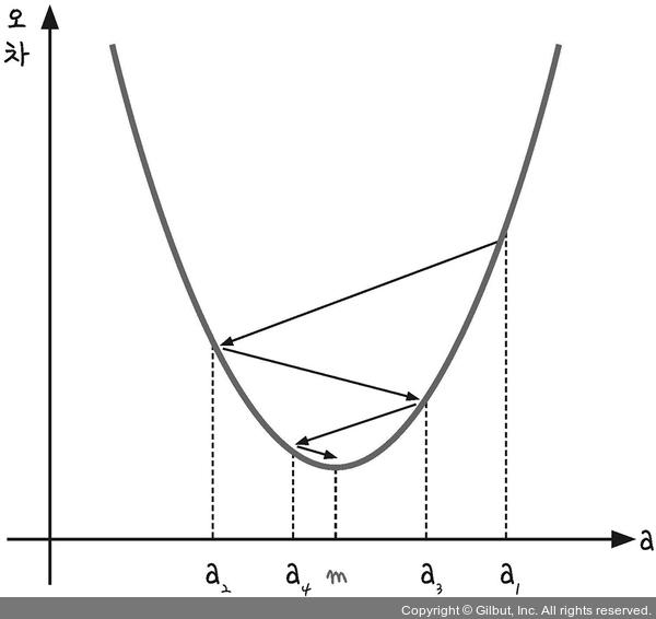 - 구해진 기울기의 반대 방향(기울기가 +면 음의 방향, -면 양의 방향)으로 얼마간 이동시킨 a2에서 미분을 구한다(그림 4-3 참조).