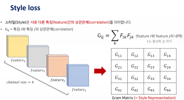 - 일반적으로 3~4개 정도의 레이어에서 Gram Matrix를 구해 유사해지도록 진행이 됩니다.